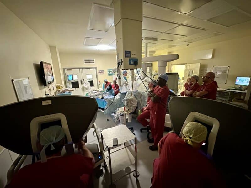Bilde 3: fra robotstue ved Queen Alexandra Hospital i Portsmouth (prof. Khan nede til venstre i bildet og «robotic fellow» i tvillingkonsoll nede til høyre i bildet)