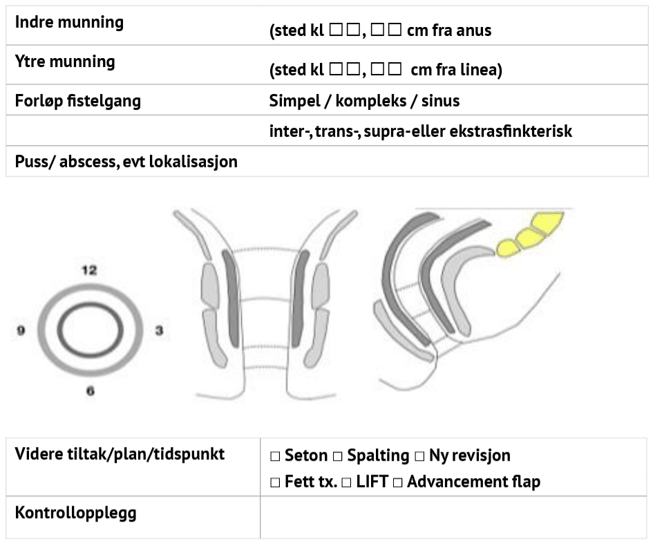 Perianale fistler kan ha varierende utbredelse, beskaffenhet og kompleksitet, fra enkle hudforbindelser til mer omfattende affeksjon av bekkenstrukturer. Vi vurderer fistelens forløp gjennom sfinkterapparatet og dens kompleksitet. En simpel fistel har kun et enkelt fistelforløp, mens en kompleks fistel har flere forgreininger eller sinuser/fistelganger. For transsfinkteriske fistler vurderes også hvor mye av eksterne anale sfinkter (EAS) som er affisert, og under 30% regnes som mindre kompleks og kan være spaltbar. Tilhørende abscesser og sårkaviteter øker også fistelkompleksiteten, likeledes beliggenhet fortil hos kvinner. For kontinuitet i behandlingen tegner vi gjerne fistelens forløp gjennom anus/sfinkter inn i 3 plan i ett fistelkart (Figur 2).