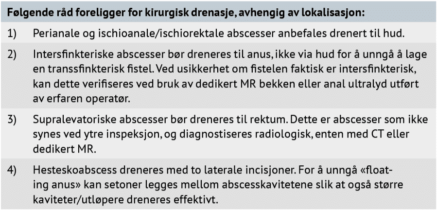 Perianale abscesser kan oppstå akutt eller som en komplikasjon til etablerte fistler (Figur 1). Behandlingen er kirurgisk drenasje (Tabell 1), ofte supplert med antibiotika, spesielt om pasienten er immunsupprimert eller er preget av infeksjon. Rask intervensjon anbefales for å begrense infeksjonens utbredelse og minimere risiko for sepsis. Som for alle abscesser er det viktig å besørge optimal drenasje. Dette innebærer at hud kan ofres for å få gode åpninger, og at alle ganger og utløpere dreneres. Det er avgjørende å ha oversikt i dybden, og unngå udrenerte lokulamenter. Bruk av spekel, anoskop eller fleksibelt skop kan være nyttige hjelpemidler for å få oversikt over kaviteten og for oppnå komplett drenasje. Ved usikkerhet kan rask revisjon/«second look» være indisert.