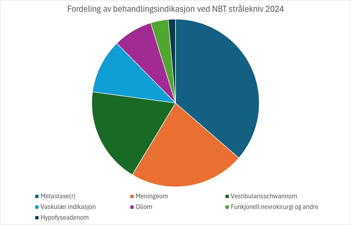 Ved Nasjonal behandlingstjeneste i strålekniv behandles et bredt spekter av intrakranielle tilstander. Som figur 3 viser, utgjør hjernemetastaser den største gruppen, etterfulgt av meningeomer, vestibularisschwannomer og hypofyseadenomer. I tillegg behandles en mindre andel vaskulære og funksjonelle lidelser, som arteriovenøse malformasjoner, trigeminusnevralgi og tremor, samt enkelte gliomresidiv og andre sjeldne tilstander.