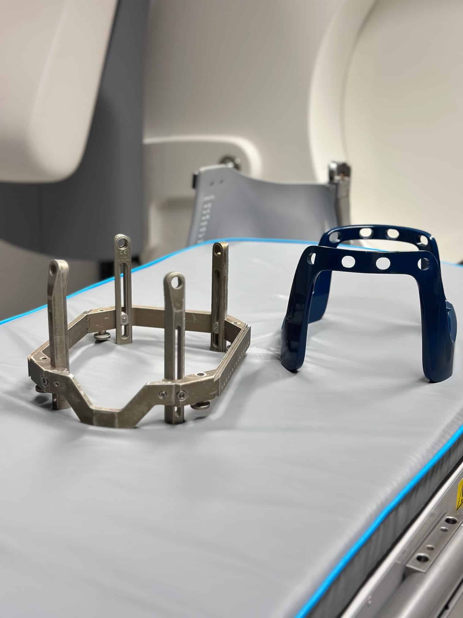 Behandlingen utføres som regel poliklinisk eller som et kort innleggelsesforløp. Om morgenen festes pasientens hode i en stereotaktisk ramme med fire små skruer under lokalbedøvelse, eventuelt med lett sedasjon (bilde 1). Ubehaget kan sammenlignes med et tannlegebesøk – ikke behagelig, men fullt gjennomførbart – og mange opplever at den største belastningen er knyttet til det ukjente, noe som kan forebygges med god informasjon på forhånd. Rammen gir både mekanisk stabilitet og geometrisk referanse, eliminerer bevegelse og muliggjør ekstrem presisjon. Dette er en forutsetning for at bestrålingen kan gis som en nøyaktig engangsintervensjon uten marginer.